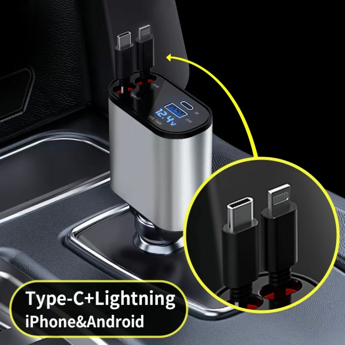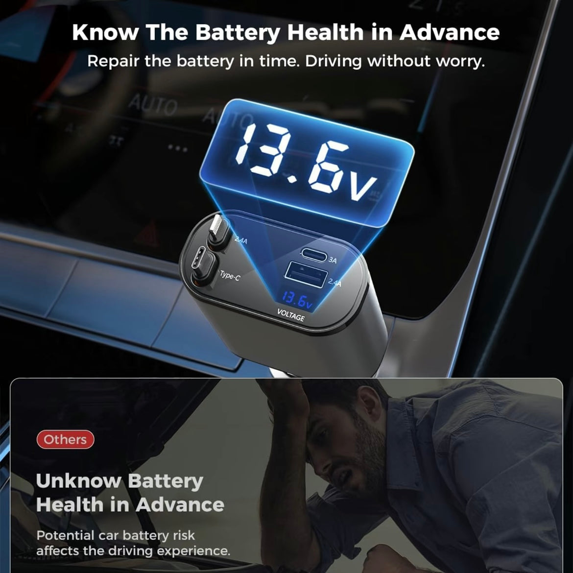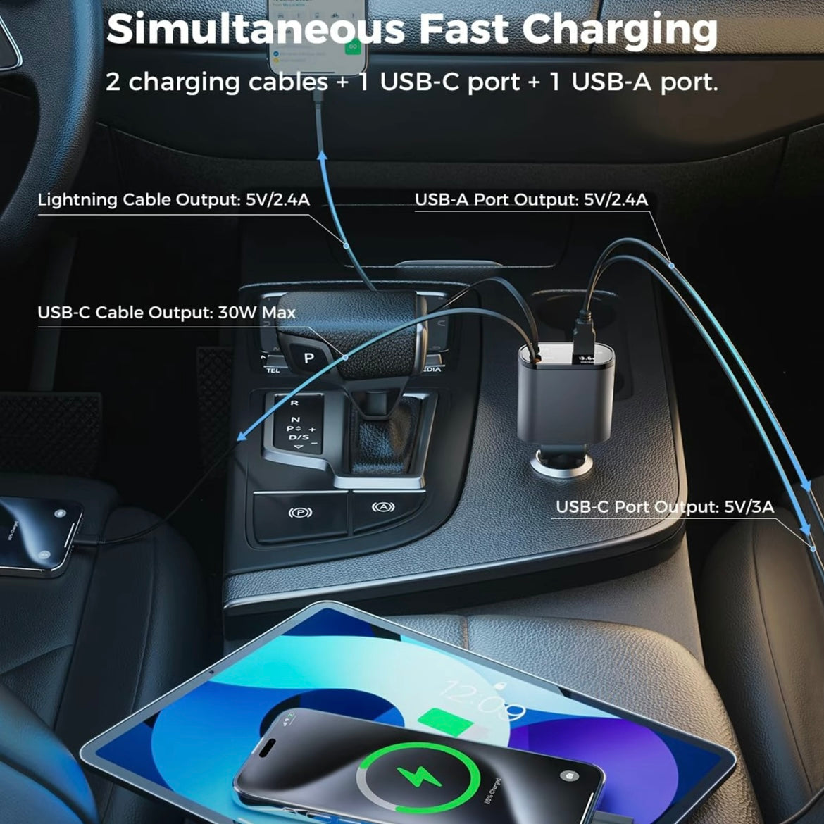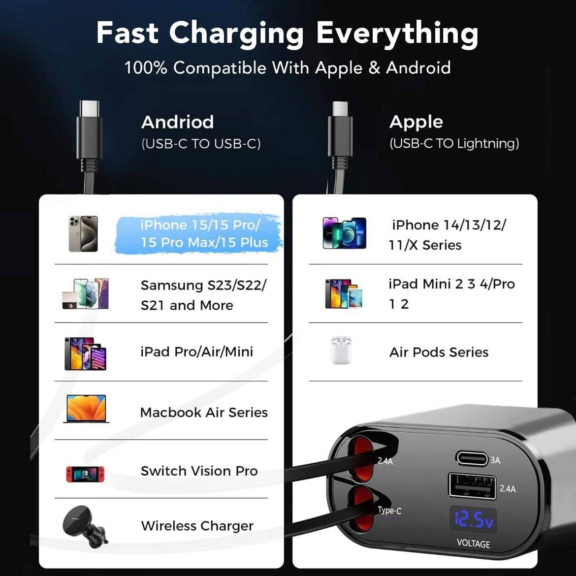 This 4 in 1 car charger organizer not only benefits you by keeping your car free from messy cables but also features advanced technology that makes it the best of all. With extendable and retractable charging cables, you don't need to worry about having them scattered around the car because they automatically retract back to their base and are sufficiently long to charge devices anywhere in the car. With 100W fast charging, it also outcompetes other car charger organizers by giving you the advantage of temperature control protection, preventing your devices from overheating. Additionally, the head direction can be adjusted 180 degrees.